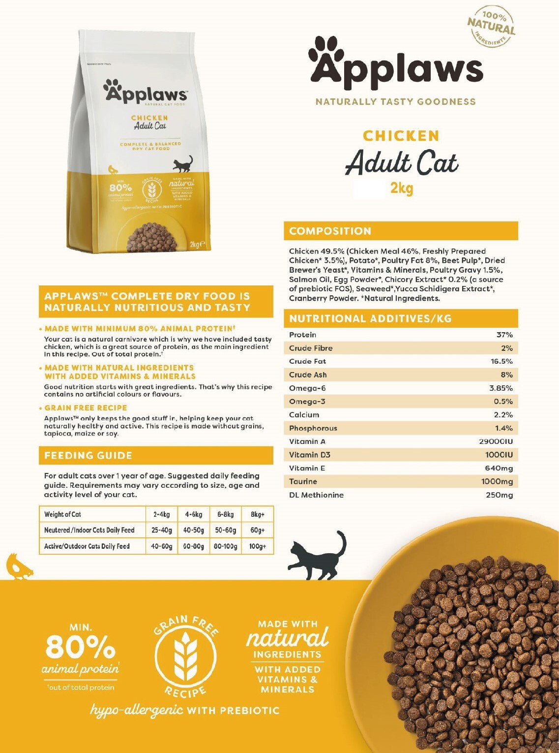 Chicken 49.5% (Chicken Meal 46%, Freshly Prepared Chicken* 3.5%), Potato*, Poultry Fat 8%, Beet Pulp*, Dried Brewer’s Yeast*, Vitamins & Minerals, Poultry Gravy 1.5%, Salmon Oil, Egg Powder*, Chicory Extract* 0.2% (a source of prebiotic FOS), Seaweed*, Yucca Schidigera Extract*, Cranberry Powder. *Natural Ingredients.
