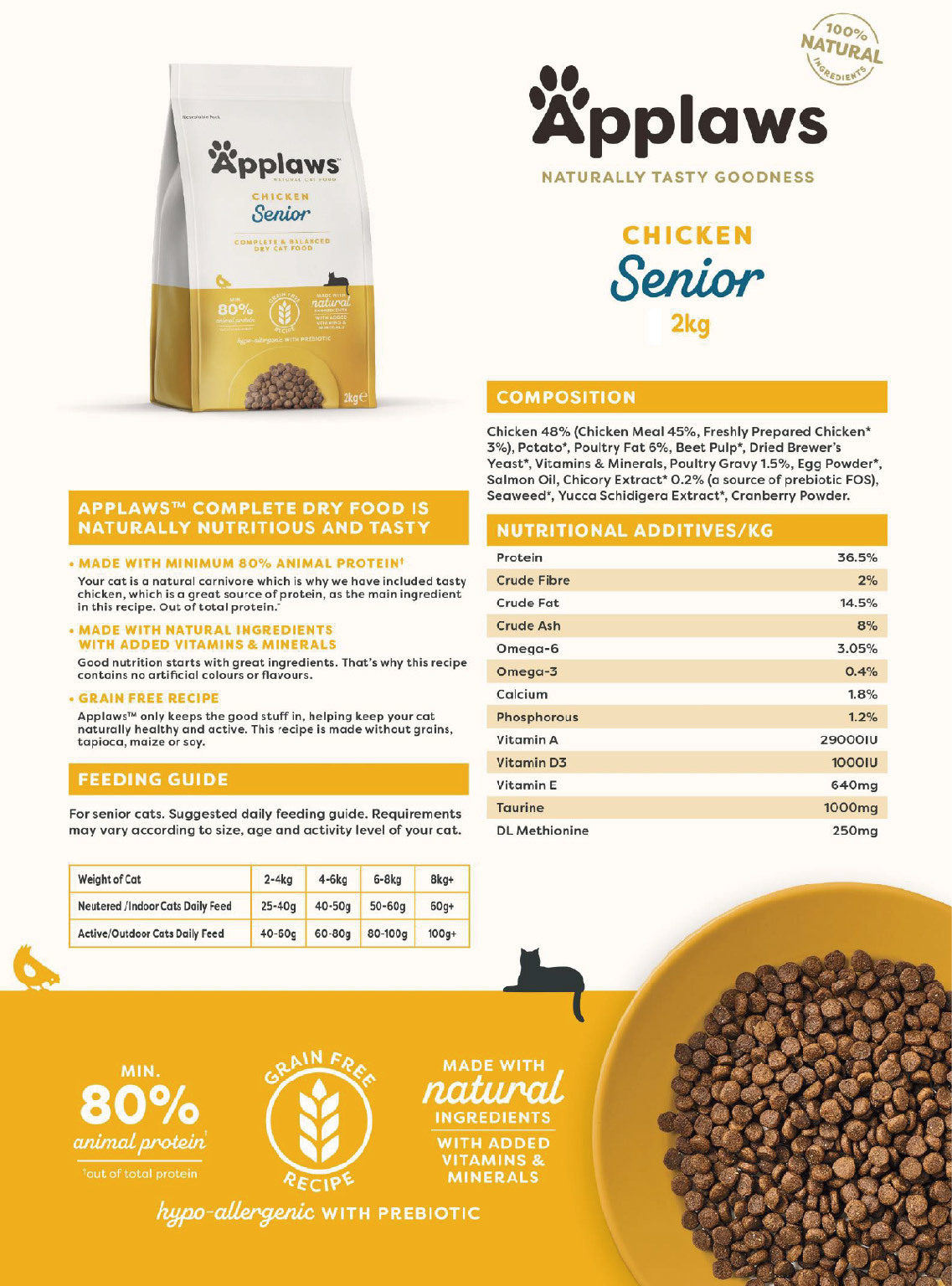 Chicken 48% (Chicken Meal 45%, Freshly Prepared Chicken* 3%), Potato*, Poultry Fat 6%, Beet Pulp*, Dried Brewer’s Yeast*, Vitamins & Minerals, Poultry Gravy 1.5%, Egg Powder*, Salmon Oil, Chicory Extract* 0.2% (a source of prebiotic FOS), Seaweed*, Yucca Schidigera Extract*, Cranberry Powder. *Natural Ingredients.