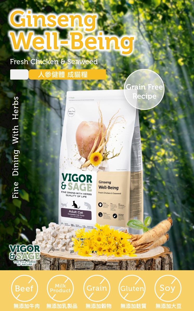 Fresh boneless chicken (26.0%), dried chicken (22.0%), dried potatoes, dried peas, chicken fat, salmon oil, flaxseeds, seaweed (0.4%), dried beets (desugarized), brewer's yeast, ginseng (0.14 %), Poria (0.14%), wild chrysanthemum (0.14%), dried tomatoes, dried carrots, dried lemons, dried apples, cranberries, dried kiwis, dried bananas, fructo-oligosaccharides (FOS), yucca.