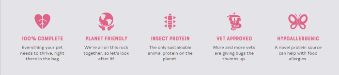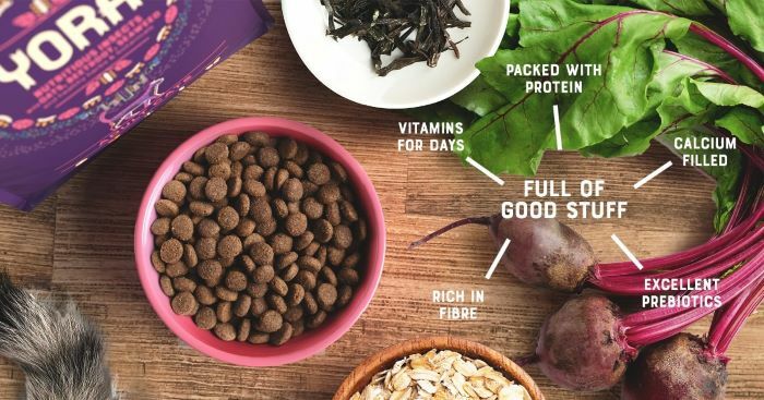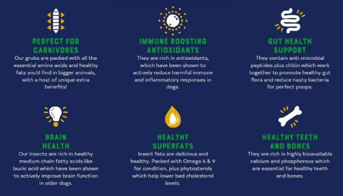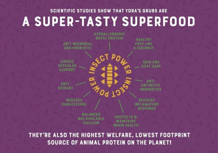 62.5% Insect (Insect Meal 40%, Freshly Prepared Insect 19.5%, Insect Oil 3%), Oats (7%), Potato (6.5%), Maize Gluten, Maize, Brewer's Yeast, Peas, Minerals, Linseed, Tomato Pomace, Vegetable Gravy, Dried Seaweed (0.4%), Chicory (0.4%), Dried Beetroot (0.4%), Dried Carrot, Pumpkin, Dried Parsley, Dried Kale, Chondroitin Sulphate (290mg/kg), Glucosamine (290mg/kg).