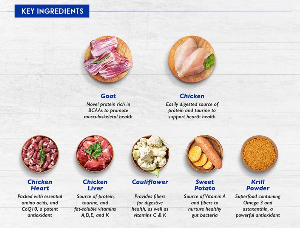Goat (35%), Chicken (23%), Chicken Liver (13%), Cauliflower (9%), Chicken Heart (8%), Green Beans (5%), Sweet Potato (3%), Apple Pomace (1%), Krill Powder (1%), Minerals (Dicalcium Phosphate, Calcium Carbonate, Magnesium Sulphate, Zinc Amino Acid Complex, Manganese Amino Acid Complex, Copper Glycine Complex), Inulin, Salt, Kelp, Vitamins (Vitamin E Supplement, Vitamin B1 Supplement, Vitamin D3 Supplement)