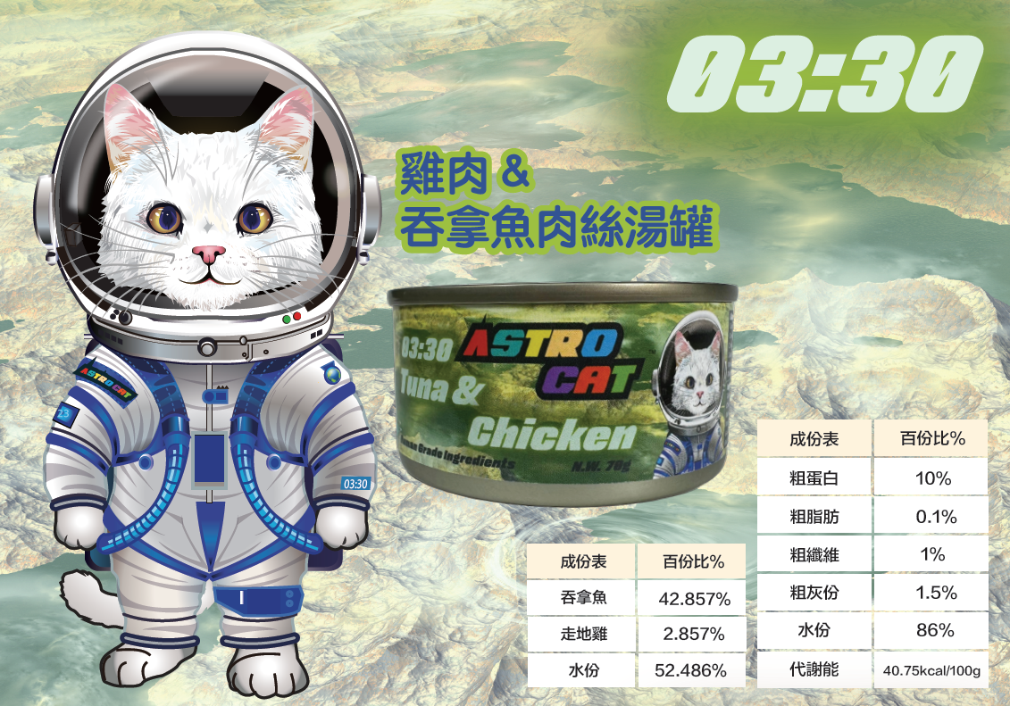 吞拿魚 42.857%、走地雞 2.857%、水份 52.486%、改性木薯澱粉、瓜爾膠、魚萃取物