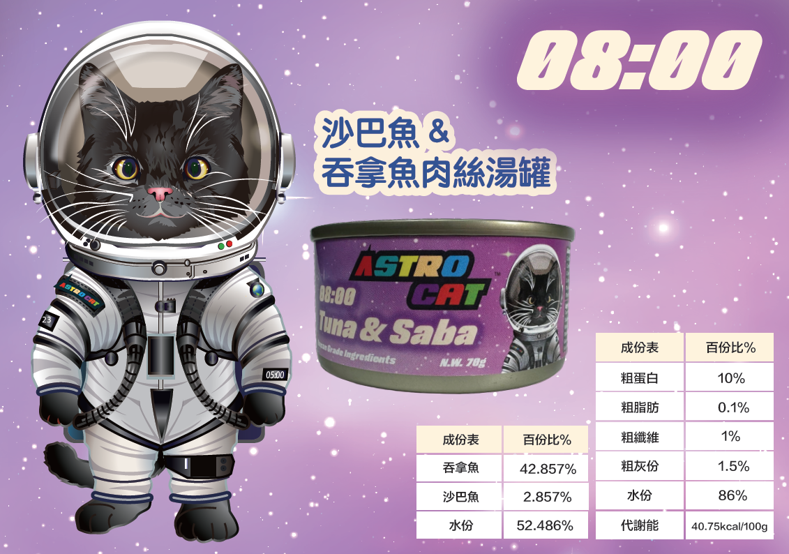 吞拿魚 42.857%、沙巴魚 2.857%、水份 52.486%、改性木薯澱粉、瓜爾膠、魚萃取物