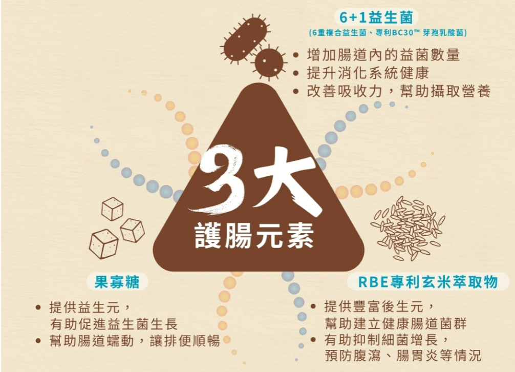 BC30™ 芽孢乳酸菌、複合益生菌 (嗜酸乳桿菌NCFM, 鼠李糖乳桿菌HN001, 雷特氏雙歧桿菌HN019, 長雙歧桿菌, 副乾酪乳桿菌, 植物乳桿菌)、果寡醣、專利RBE玄米萃取物、Fibersol-2 膳食纖維