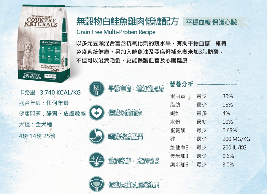 雞肉粉、 扁豆、 鷹嘴豆、 蠶豆、 豬肉粉、 雞肉脂肪(與生育酚,即維他命 E 混合)、 白魚粉、 木薯、 亞麻籽粉、 馬鈴薯蛋白質、 苜蓿草粉、 天然雞肝調味、 乾海帶、 鯡魚油(與生育酚,即維他命 E 混合)、 乾紅蘿蔔、 乾菠菜、 南瓜粉、小紅莓、 藍莓、 DL-蛋氨酸、 L-離氨酸、 氯化膽鹼、 碳酸鈣、 磷酸二氫鈉、 乾嗜酸乳桿菌發酵物、 枯草芽孢桿菌發酵產物、 乾雙歧桿菌嗜熱發酵物、 乾長雙歧桿菌發酵物、 乾屎腸球菌發酵物、 鋅蛋白、 維他命 E 補充劑、 煙酸、 硫酸鋅、硫酸亞鐵、 核黃素、 銅蛋白、 錳蛋白、 維他命 A 補充劑、硫酸銅、 d-泛酸鈣、 維他命 B12 補充劑、 硫酸錳、 生物素(維他命 B7)、 維他命 D3 補充劑、 鈷蛋白、 硫胺素硝酸鹽(維他命 B1 硝酸鹽 )、 葉酸 (維他命 B9)、 亞硒酸鈉、 碘酸鈣