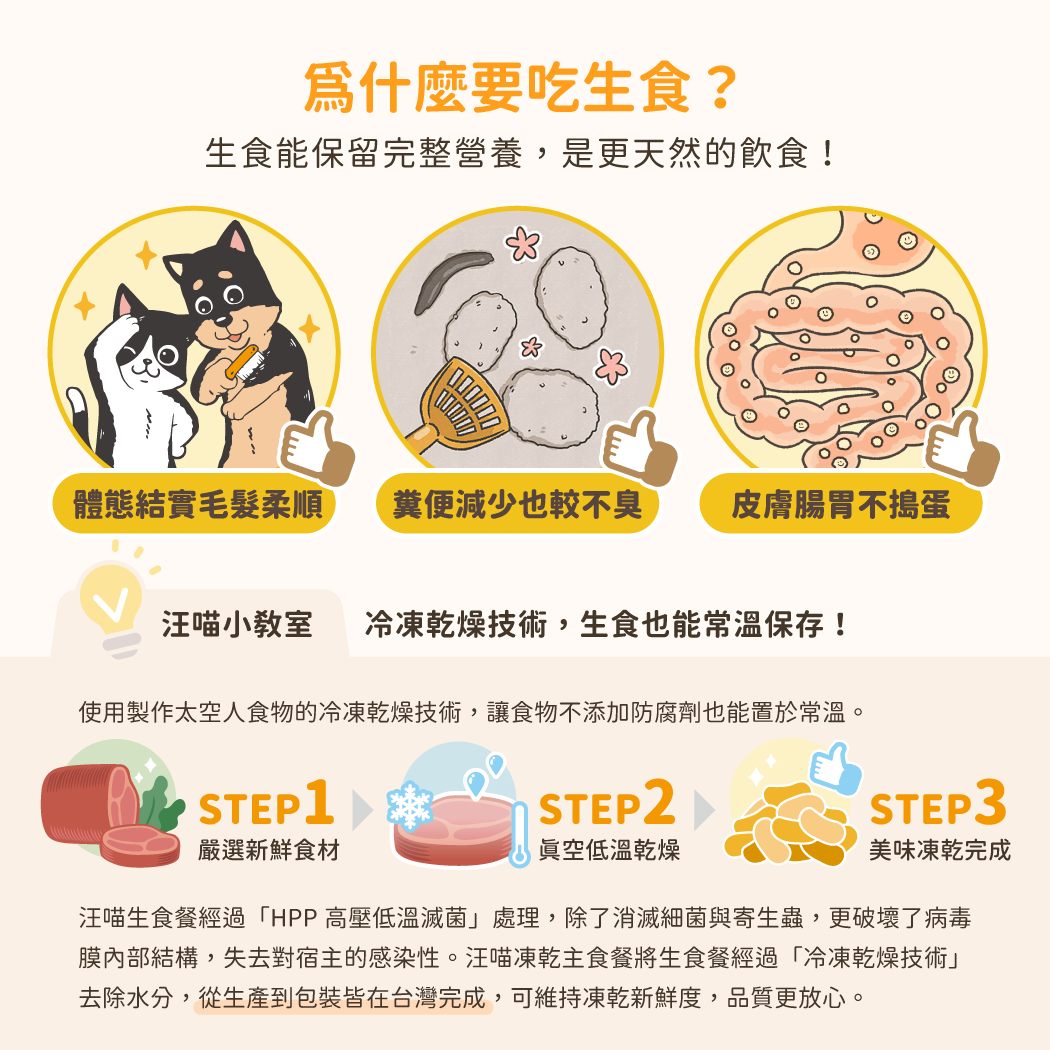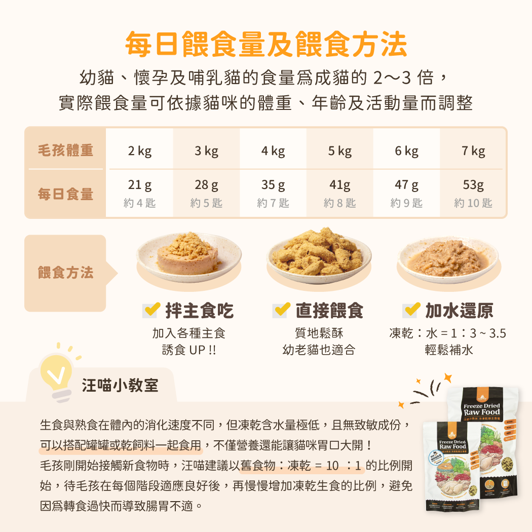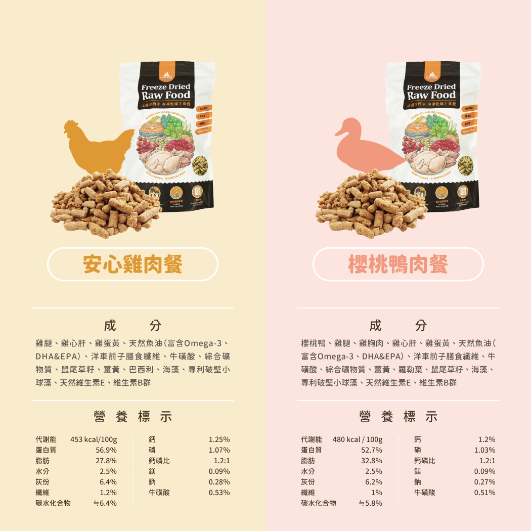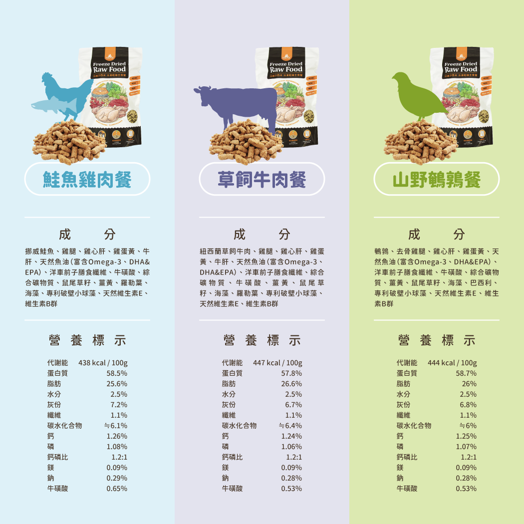 **鳥禽類(雞/鴨)及海鮮(魚類)是較細的肉類纖維,所以凍乾在質地上是呈現比較偏向鬆軟的狀態,產品可能是顆粒狀或鬆狀。但不會影響該產品的營養價值**