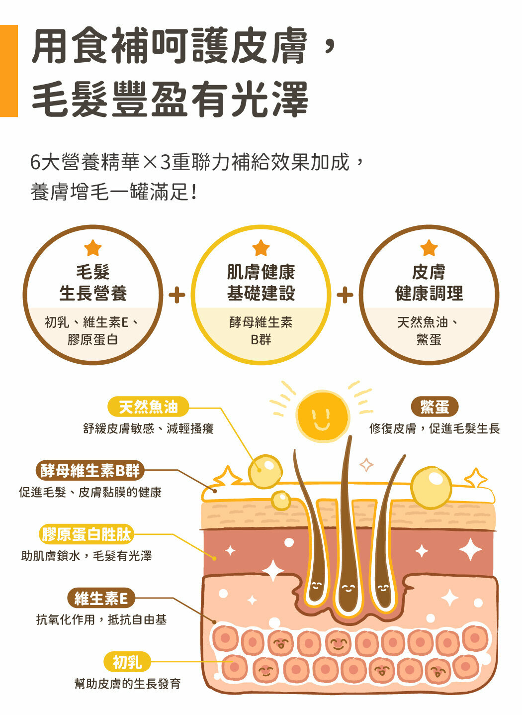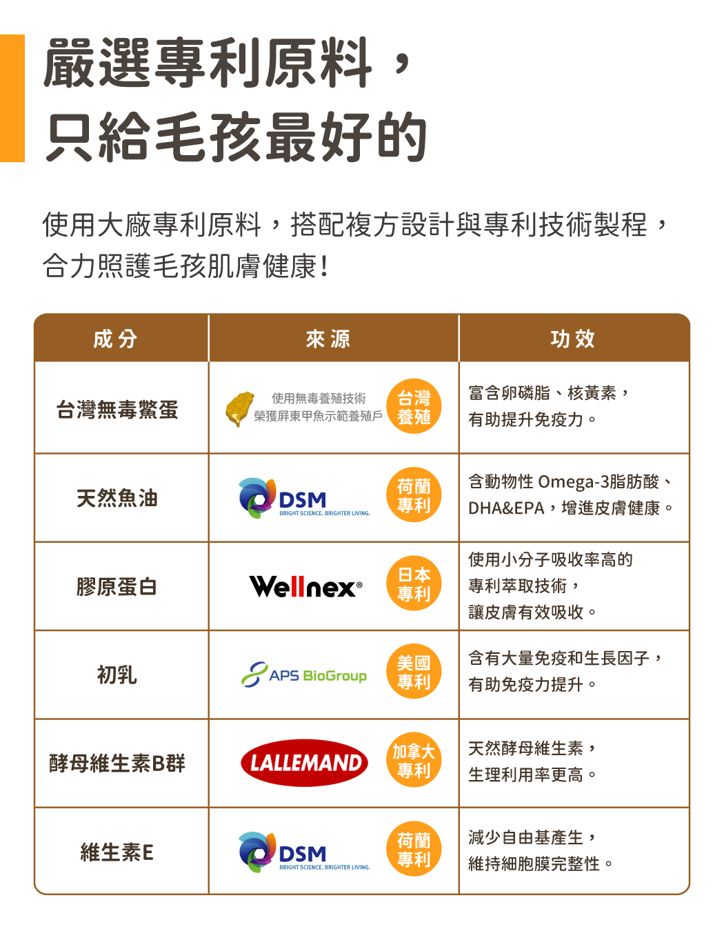 • 天然鱉蛋 & 五大國際專利原料,讓毛孩皮膚健康、毛髮濃密。