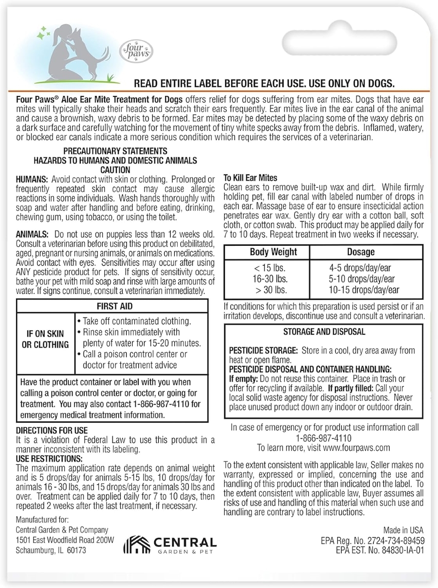 Help your furry friend look and feel their very best with Healthy Promise Aloe Ear Mite Treatment for dogs. These drops kill ear mites on contact for quick relief. Dogs with ear mites typically shake their heads and scratch their ears frequently, and you can detect ear mites by placing some of your dog's waxy debris on a dark surface and carefully watching for tiny white specks to move away from the debris. To help soothe your canine's irritated skin, these drops also contain aloe vera. This dog ear mite medicine is intended for dogs and puppies older than 12 weeks.