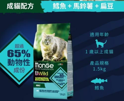 指定商品,優惠:Monge BWild 貓乾糧 - 3件或以上 85折 (可混味)