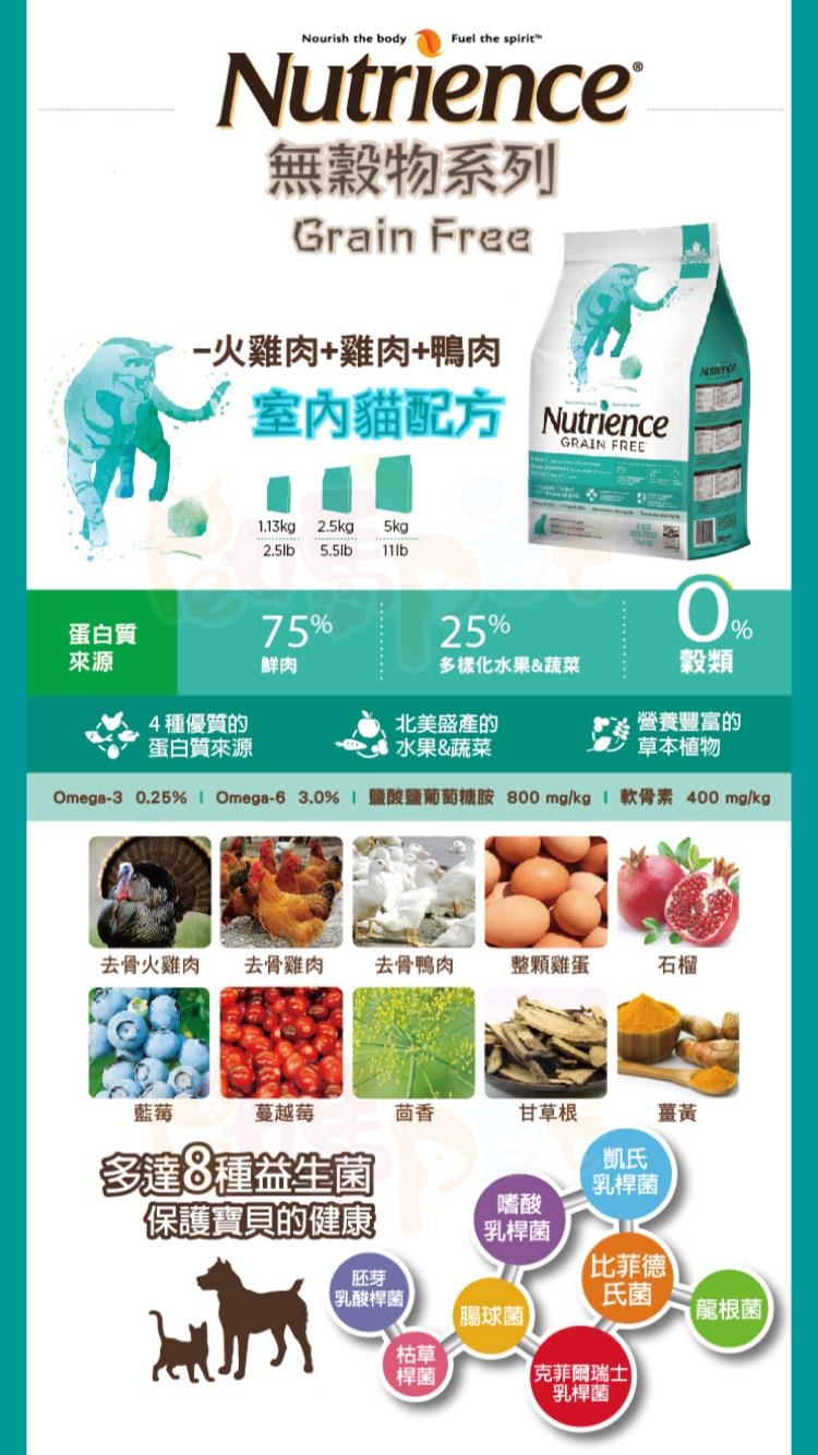 去骨火雞、雞肉粉、火雞肉粉、豌豆、甘薯、扁豆、乾紫花苜蓿、豌豆纖維、木薯、去骨鴨、去骨雞、全蛋、天然雞肉口味、雞脂肪(以維他命E做天然防腐)、雞肝、車前草、三文魚油(DHA來源)、椰油、南瓜、冬南瓜、胡蘿蔔、菠菜、西蘭花、蘋果、洋梨、藍莓、紅莓、石榴、杜松子、薑、茴香、綠茶萃取、薄荷葉、甘草、薑黃、維他命 [維他命E、維他命C、維他命A、菸鹼酸(維他命B3)、泛酸鈣(維他命B5)、肌醇、核黃素(維他命B2)、鹽酸多醇(維他命B6)、硫胺素(維他命B1)、維他命H、維他命B12、維他命D3、葉酸]、礦物質 [氧化鋅、鋅蛋白、鐵蛋白、硫酸亞鐵、銅蛋白、硫酸銅、錳蛋白、氧化錳、碘酸鈣、亞硒酸鈉]、氯化膽脂、卵磷脂、DL-蛋氨酸、鹽、氯化鉀、牛磺酸、菊苣根萃取、海藻、酵母萃取、鹽酸葡萄糖胺、L-賴氨酸、百里香萃取、迷迭香萃取、絲蘭萃取、硫酸軟骨素、菠蘿萃取、左旋肉鹼、益生菌