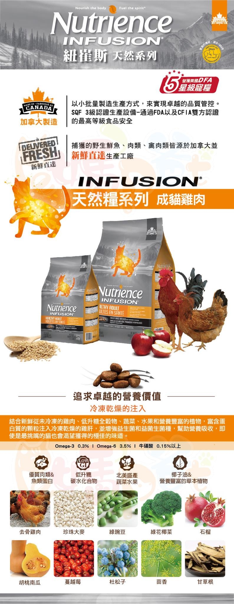 去骨雞肉,雞肉粉,燕麥片,大麥,豌豆,紅扁豆,雞肉脂肪(與生育酚混合保存),天然雞肉風味,曬乾的苜蓿,凍乾雞肝,鮭魚油,椰子油,南瓜,胡桃南瓜,胡蘿蔔,菠菜,西蘭花,蘋果,藍莓,酸果蔓,石榴,杜松子提取物,姜,茴香,洋甘菊,薄荷葉,甘草根,薑黃,維生素(維生素E補充劑,維生素A補充劑,菸酸,泛酸鈣) ,核黃素,鹽酸吡ido醇,單硝酸硫胺素,生物素,維生素B12補充劑,維生素D3補充劑,葉酸),礦物質(硫酸鋅,蛋白質鋅,蛋白質鐵,硫酸亞鐵,銅蛋白質,硫酸銅,錳蛋白質,氧化錳,鈣碘酸鹽,亞硒酸鈉),卵磷脂,鹽,氯化膽鹼,氯化鉀,菊苣根提取物,酵母提取物,碳酸鈣,DL-蛋氨酸,L-賴氨酸,牛磺酸,迷迭香提取物,乾燥的乳桿菌我們使用嗜酸菌發酵產品,乾酪乳桿菌發酵產品,雙歧雙歧桿菌乾燥產品,糞腸球菌乾燥產品