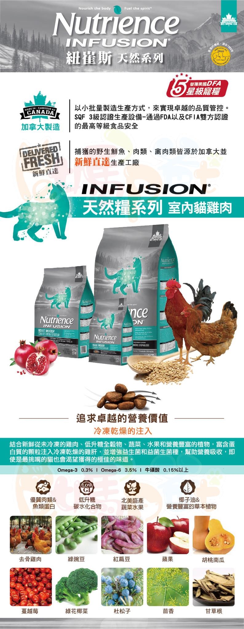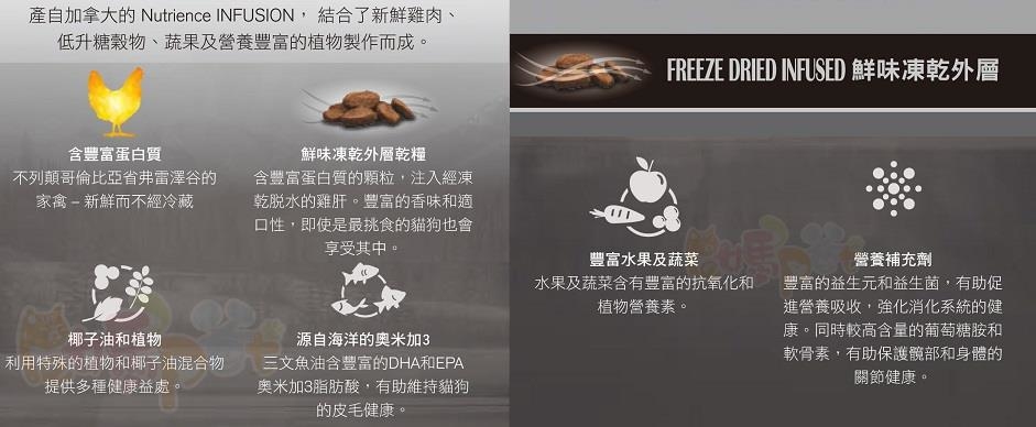 去骨雞肉,雞肉茸,燕麥,珍珠大麥,綠豌豆,紅扁豆,雞脂(以維生素E保鮮),天然雞肉風味,曬乾苜蓿, 雞肝凍乾,鮭魚油,椰子油,南瓜,胡桃南瓜,胡蘿蔔,菠菜,綠花椰菜,蘋果,藍莓,蔓越莓,石榴, 杜松子萃取物,薑,茴香,洋甘菊,薄荷葉,甘草根,薑黃,維生素(維生素E補充,維生素A補充, 菸鹼酸(維生素B3),泛酸鈣(維生素B5),核黃素(維生素B2),鹽酸吡哆醇(維生素B6),硫胺素(維生素B1), 生物素(維生素H),維生素B12補充,維生素D3補充,葉酸),礦物質(硫酸鋅,蛋白質鋅,蛋白質鐵, 硫酸亞鐵,蛋白質銅,硫酸銅,蛋白質錳,氧化錳,碘酸鈣,亞硒酸鈉),卵磷脂,鹽,氯化膽鹼,氯化鉀, 菊苣根萃取物,酵母萃取物,碳酸鈣,DL-蛋氨酸,L-離氨酸,牛磺酸,鹽酸鹽葡萄糖胺,軟骨素, 迷迭香提取物,嗜酸乳桿菌,凱氏乳桿菌,比菲德氏菌,腸球菌
