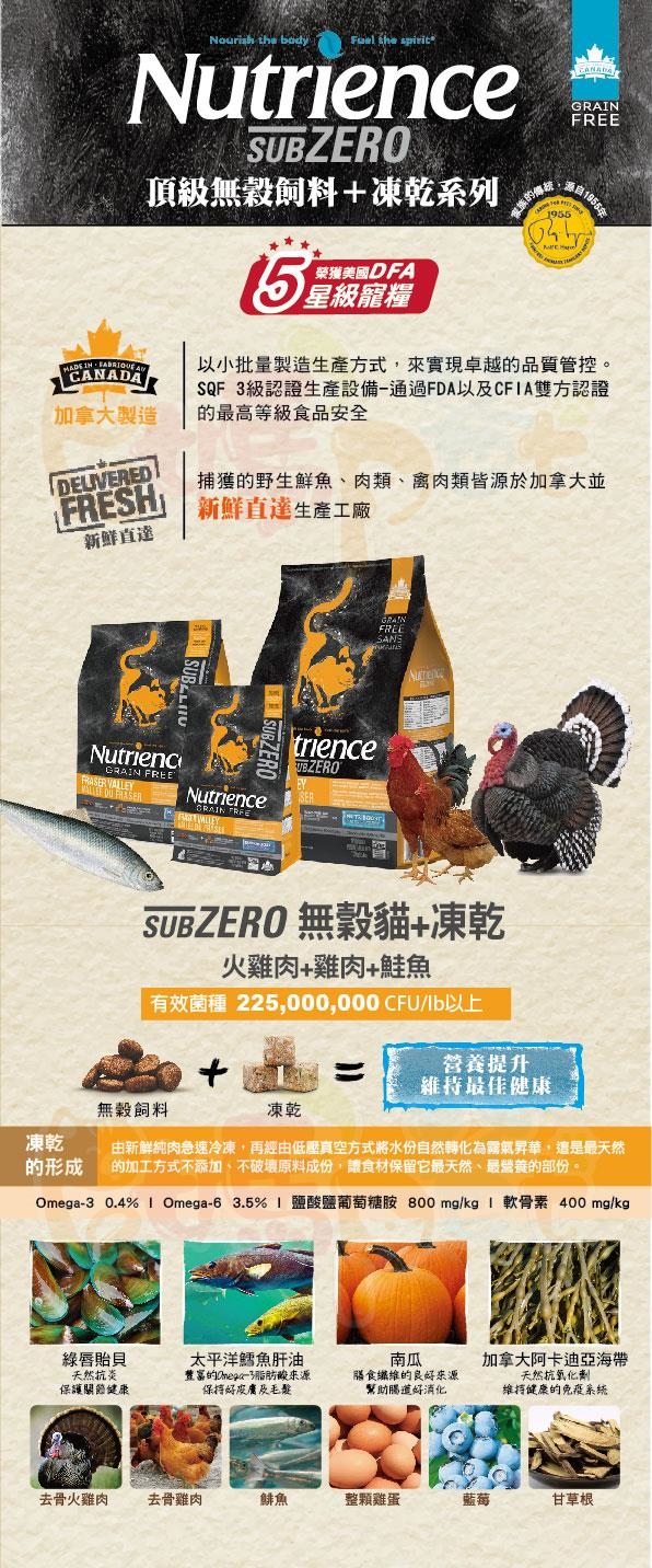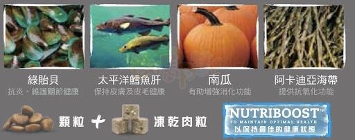 去骨雞肉、去骨火雞肉、雞茸、火雞茸、三文魚、雞肝、雞心臟、火雞肝、火雞心臟、鯡魚、鱈魚、鱈魚肝、雞蛋、豌豆、雞肉脂肪(以維他命E做天然防腐)、紅扁豆、甘薯、鷹嘴豆、天然雞肉口味、乾紫花苜蓿、凍乾雞肉、凍乾南瓜、凍乾雞肝、凍乾綠貽貝、凍乾鱈魚肝、凍乾海帶、三文魚油、鯡魚油、椰子油、南瓜、冬南瓜、胡蘿蔔、菠菜、西蘭花、蘋果、藍莓、紅莓、石榴、杜松子、薑、茴香、洋甘菊、薄荷葉、甘草、薑黃、纈草根、維他命 [維他命E、維他命C、維他命A、菸鹼酸(維他命B3)、泛酸鈣(維他命B5)、肌醇、核黃素(維他命B2)、鹽酸多醇(維他命B6)、硫胺素(維他命B1)、維他命H、維他命B12、維他命D3、葉酸]、礦物質 [氧化鋅、鋅蛋白、鐵蛋白、硫酸亞鐵、銅蛋白、硫酸銅、錳蛋白、氧化錳、碘酸鈣、亞硒酸鈉]、鹽、氯化膽脂、牛磺酸、氯化鉀、DL-蛋氨酸、L-賴氨酸、菊苣根萃取、絲蘭萃取、酵母萃取、百里香萃取、鹽酸葡萄糖胺、迷迭香萃取、硫酸軟骨素、左旋肉鹼、益生菌