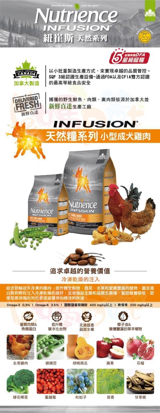 去骨雞肉,雞肉茸,燕麥,珍珠大麥,綠豌豆,紅扁豆,雞脂(以維生素E保鮮),天然雞肉風味,曬乾苜蓿, 雞肝凍乾,鮭魚油,椰子油,碳酸鈣,南瓜,胡桃南瓜,胡蘿蔔,菠菜,綠花椰菜,蘋果,藍莓,蔓越莓, 石榴,杜松子萃取物,薑,茴香,洋甘菊,薄荷葉,甘草根,薑黃,維生素(維生素E補充,維生素A補充, 菸鹼酸(維生素B3),泛酸鈣(維生素B5),核黃素(維生素B2),鹽酸吡哆醇(維生素B6),硫胺素(維生素B1), 生物素(維生素H),維生素B12補充,維生素D3補充,葉酸),礦物質(硫酸鋅,蛋白質鋅,蛋白質鐵, 硫酸亞鐵,蛋白質銅,硫酸銅,蛋白質錳,氧化錳,碘酸鈣,亞硒酸鈉),氯化鉀,鹽,卵磷脂,氯化膽鹼, 菊苣根萃取物,酵母萃取物,DL-蛋氨酸,L-離氨酸,鹽酸鹽葡萄糖胺,軟骨素,迷迭香萃取物,嗜酸乳桿菌, 凱氏乳桿菌,比菲德氏菌,腸球菌