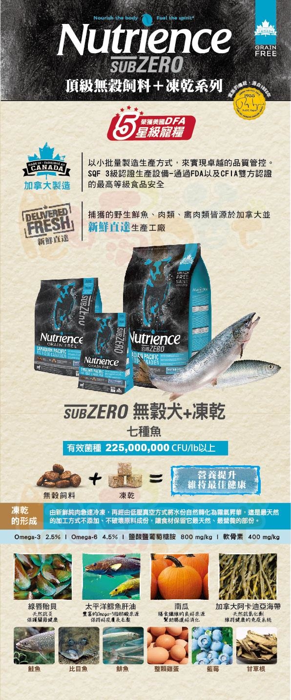 三文魚、鯡魚、鱈魚、鰨魚、鱈魚、鰈魚、鱸魚、鱈魚肝、三文魚茸、鯡魚茸、鱈魚茸、鱸魚茸、豌豆、紅扁豆、菜籽油(以維他命E做天然防腐)、甘薯、鷹嘴豆、雞蛋、天然魚肉口味、乾紫花苜蓿、凍乾三文魚肉、凍乾鯡魚肉、凍乾南瓜、凍乾綠貽貝、凍乾鱈魚肝、凍乾海帶、三文魚油、鯡魚油、椰子油、南瓜、冬南瓜、胡蘿蔔、菠菜、西蘭花、蘋果、藍莓、紅莓、石榴、杜松子、薑、茴香、洋甘菊、薄荷葉、甘草、薑黃、維他命 [維他命E、維他命C、維他命A、菸鹼酸(維他命B3)、泛酸鈣(維他命B5)、肌醇、核黃素(維他命B2)、鹽酸多醇(維他命B6)、硫胺素(維他命B1)、維他命H、維他命B12、維他命D3、葉酸]、礦物質 [氧化鋅、鋅蛋白、鐵蛋白、硫酸亞鐵、銅蛋白、硫酸銅、錳蛋白、氧化錳、碘酸鈣、亞硒酸鈉]、鹽、氯化膽脂、氯化鉀、L-賴氨酸、DL-蛋氨酸、菊苣根萃取、絲蘭萃取、酵母萃取、百里香萃取、鹽酸葡萄糖胺、迷迭香萃取、牛磺酸、硫酸軟骨素、左旋肉鹼、益生菌