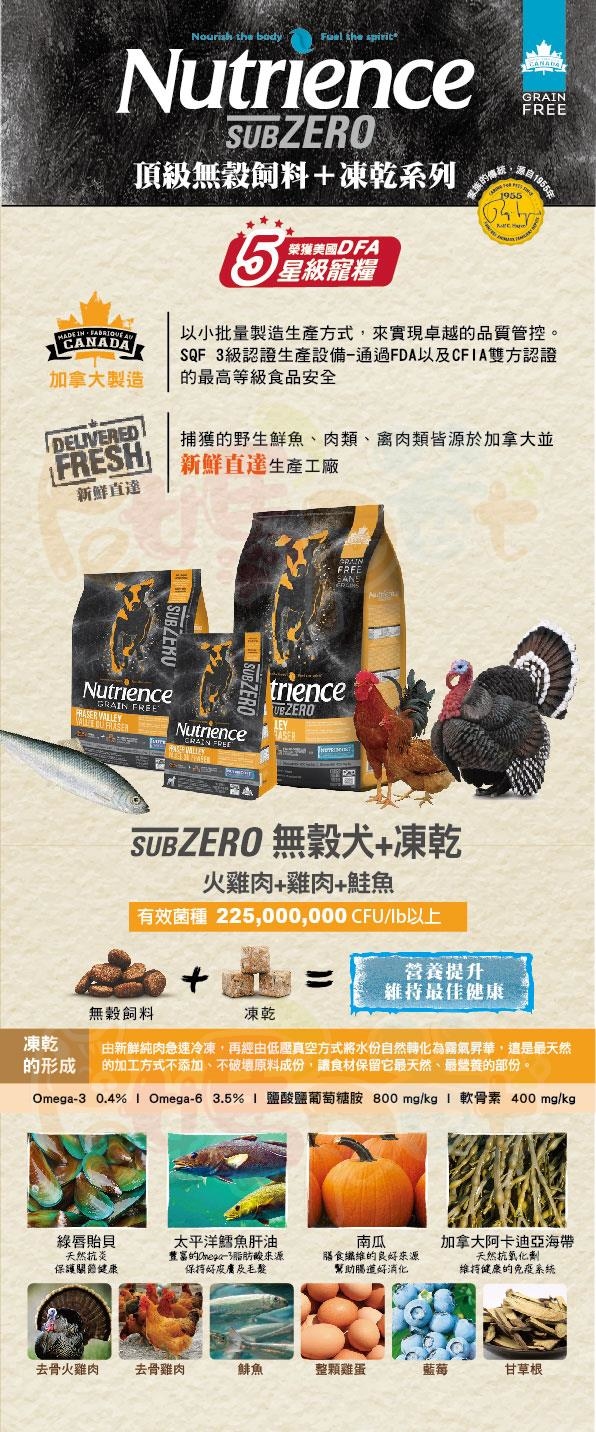 去骨雞肉、去骨火雞肉、雞茸、火雞茸、三文魚、雞肝、雞心臟、火雞肝、火雞心臟、鯡魚、鱈魚、鱈魚肝、豌豆、紅扁豆、雞肉脂肪(以維他命E做天然防腐)、甘薯、鷹嘴豆、雞蛋、天然雞肉口味、乾紫花苜蓿、凍乾雞肉、凍乾南瓜、凍乾雞肝、凍乾綠貽貝、凍乾鱈魚肝、凍乾海帶、三文魚油、鯡魚油、椰子油、南瓜、冬南瓜、胡蘿蔔、菠菜、西蘭花、蘋果、藍莓、紅莓、石榴、杜松子、薑、茴香、洋甘菊、薄荷葉、甘草、薑黃、維他命 [維他命E、維他命C、維他命A、菸鹼酸(維他命B3)、泛酸鈣(維他命B5)、肌醇、核黃素(維他命B2)、鹽酸多醇(維他命B6)、硫胺素(維他命B1)、維他命H、維他命B12、維他命D3、葉酸]、礦物質 [氧化鋅、鋅蛋白、鐵蛋白、硫酸亞鐵、銅蛋白、硫酸銅、錳蛋白、氧化錳、碘酸鈣、亞硒酸鈉、鹽、氯化鉀、氯化膽脂、L-賴氨酸、DL-蛋氨酸、菊苣根萃取、絲蘭萃取、酵母萃取、百里香萃取、鹽酸葡萄糖胺、迷迭香萃取、牛磺酸、硫酸軟骨素、左旋肉鹼、益生菌
