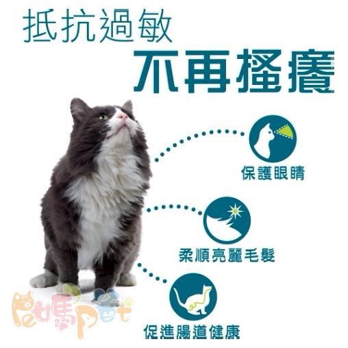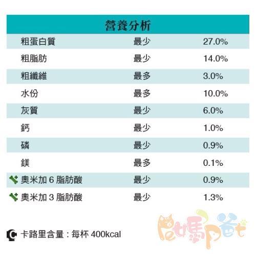 新鮮白魚(鱈魚、鰈魚、黑線鱈)、鯡魚肉茸、粗磨糙米、粗磨珍珠大麥、燕麥、芥花籽油(以維他命E及檸檬酸保鮮)、乾甜菜纖維、乾蛋製品、南瓜茸、天然酵母、粗磨原粒亞麻籽、磷酸二鈣、鯡魚油、菊糖(益菌生)、氯化鉀、新鮮紅莓、新鮮藍莓、新鮮甜薯、新鮮胡蘿蔔、新鮮蘋果、新鮮波菜、蛋胺酸、乾菠蘿、氯化膽鹼、牛磺酸、綠茶萃取物(兒茶素)、葡萄糖胺鹽酸鹽、硫酸軟骨素、絲蘭萃取物、洋芫茜、嗜酸乳酸菌、乳酸乳桿菌、酪蛋白乳酸桿菌、維他命及礦物質(硫酸鐵、氧化鋅、維他命B3、維他命E、葉酸、維他命B12、硫酸銅、氧化錳、維他命A、硒、硝酸硫胺、泛酸鈣、維他命B2、維他命B6、生物素、維他命D3、碘酸鈣)、天然調味、迷迭香萃取物(此產品可能含微量花生)