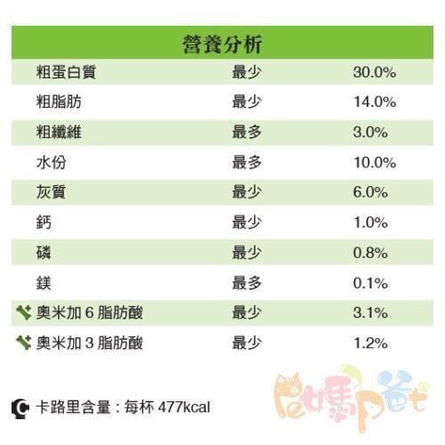新鮮去骨雞肉、雞肉茸、粗磨珍珠大麥、粗磨糙米、新鮮雞肝、魚肉茸、乾甜菜纖維、南瓜茸、雞脂肪(以維他命E及檸檬酸保鮮)、天然酵母、燕麥、乾蛋製品、粗磨原粒亞麻籽、三文魚油、菊糖(益菌生)、新鮮紅莓、新鮮藍莓、新鮮甜薯、新鮮胡蘿蔔、新鮮蘋果、新鮮波菜、氯化膽鹼、乾菠蘿、蛋胺酸、牛磺酸、綠茶萃取物(兒茶素)、嗜酸乳酸菌、乳酸乳桿菌、酪蛋白乳酸桿菌、葡萄糖胺鹽酸鹽、硫酸軟骨素、絲蘭萃取物、洋芫茜、維他命及礦物質(硫酸鐵、氧化鋅、維他命B3、維他命E、葉酸、維他命B12、硫酸銅、氧化錳、維他命A、硒、硝酸硫胺、泛酸鈣、維他命B2、維他命B6、生物素、維他命D3、碘酸鈣)、天然調味、迷迭香萃取物(此產品可能含微量花生)