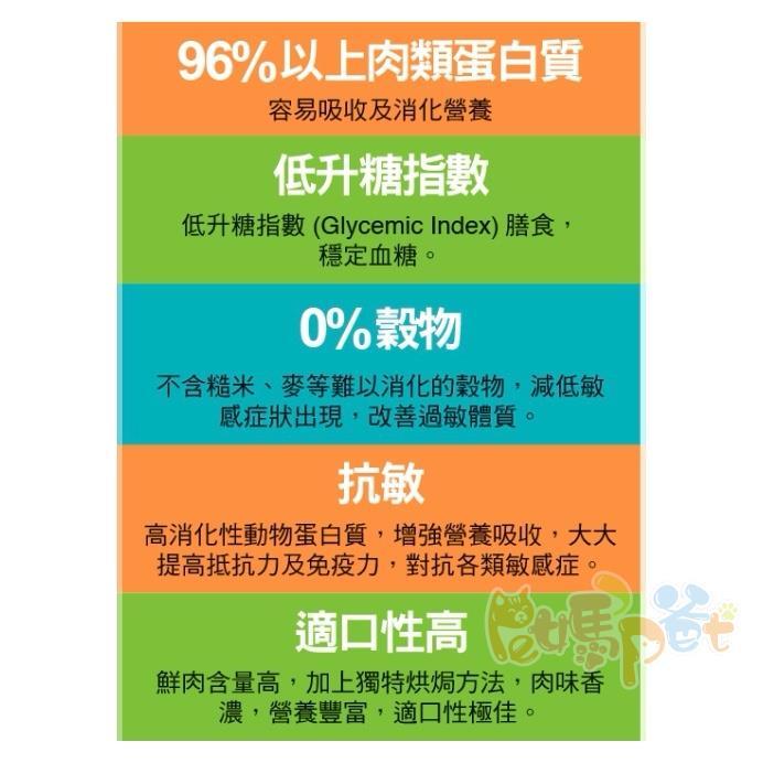 新鮮鴨肉、火雞茸、原粒豌豆、綠扁豆、鴨肉茸、原粒鷹嘴豆、 芥花籽油(以維他命E及檸檬酸保鮮)、天然調味、粗磨原粒亞麻籽、酵母、甜菜、三文魚油、硫酸鈣、菊苣(益菌生)、菠菜、海帶、 菠蘿、苜蓿、氯化鉀、氯化膽鹼、蘋果、香蕉、藍莓、西蘭花、小紅莓、 甜薯、牛磺酸、海鹽、絲蘭萃取物、硫酸鐵、硫酸鋅、DL-蛋氨酸、蛋白鋅、軟骨素、葡萄糖胺、蛋白錳、菸鹼酸、維他命E、 蛋白銅、硫酸錳、硫酸銅、維生素 A、硝酸硫胺明、本多酸鈣、核黃素、鹽酸吡哆辛、生物素、維他命B12、維他命D3、 葉酸、碘酸鈣、亞硒酸鈉、迷迭香萃取物。此產品可能含微量花生。