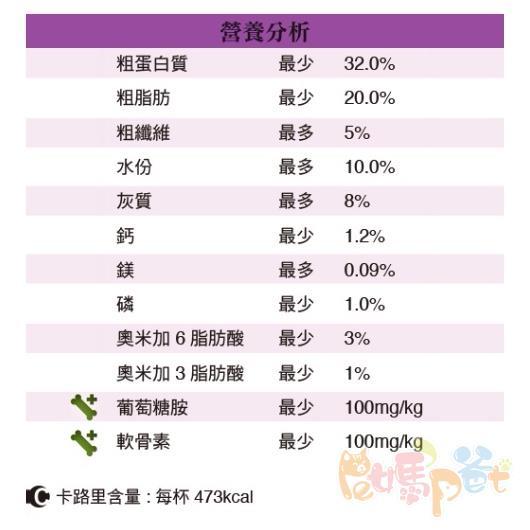 腸道益菌及葡萄糖胺同時護腸、補關節。含高達96%動物蛋白質, 激發食慾!