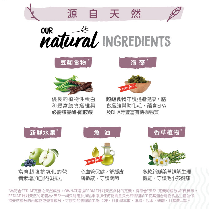 OWNAT是西班牙廠商Cotecnica的一個全新品牌,廠房始於1982年,40年歷史傳承,生產基地位於農業資源和畜牧業極為豐富的地區,鄰近農場及海岸線。為了讓毛孩都能攝取到優質蛋白質食物,我們製作乾糧時只用50%新鮮肉類即製+30%脫水肉+20%新鮮蔬果慢煮精製。極品優質在於我們成份天然,符合FEDIAF指定標準定義之天然成份,生產過程全由APPLUS 質量保證體系 ISO9001-2015 監督。