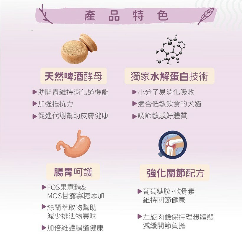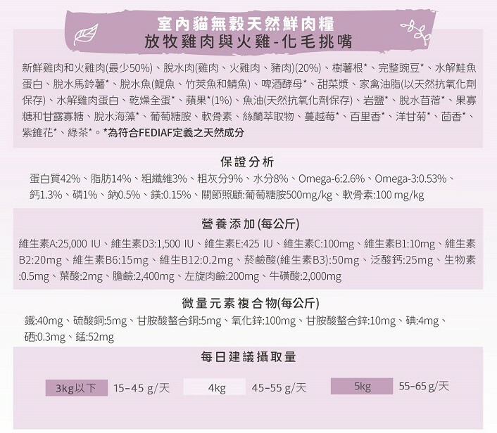 蛋白質42%、脂肪14%、粗纖維3%、粗灰粉9%、水份8%、Omega6 2.6%、Omega30.53%、鈣1.3%、磷1%、鈉0.5%、鎂0.15%、葡萄糖胺500mg/kg、軟骨素100mg/kg