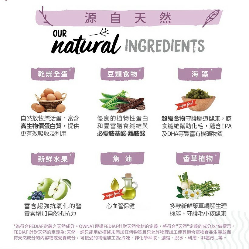 OWNAT是西班牙廠商Cotecnica的一個全新品牌,廠房始於1982年,40年歷史傳承,生產基地位於農業資源和畜牧業極為豐富的地區,鄰近農場及海岸線。為了讓毛孩都能攝取到優質蛋白質食物,我們製作乾糧時只用50%新鮮肉類即製+30%脫水肉+20%新鮮蔬果慢煮精製。極品優質在於我們成份天然,符合FEDIAF指定標準定義之天然成份,生產過程全由APPLUS 質量保證體系 ISO9001-2015 監督。