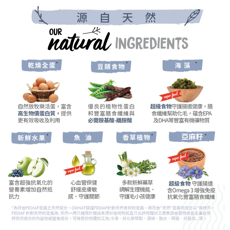 OWNAT是西班牙廠商Cotecnica的一個全新品牌,廠房始於1982年,40年歷史傳承,生產基地位於農業資源和畜牧業極為豐富的地區,鄰近農場及海岸線。為了讓毛孩都能攝取到優質蛋白質食物,我們製作乾糧時只用50%新鮮肉類即製+30%脫水肉+20%新鮮蔬果慢煮精製。極品優質在於我們成份天然,符合FEDIAF指定標準定義之天然成份,生產過程全由APPLUS 質量保證體系 ISO9001-2015 監督。