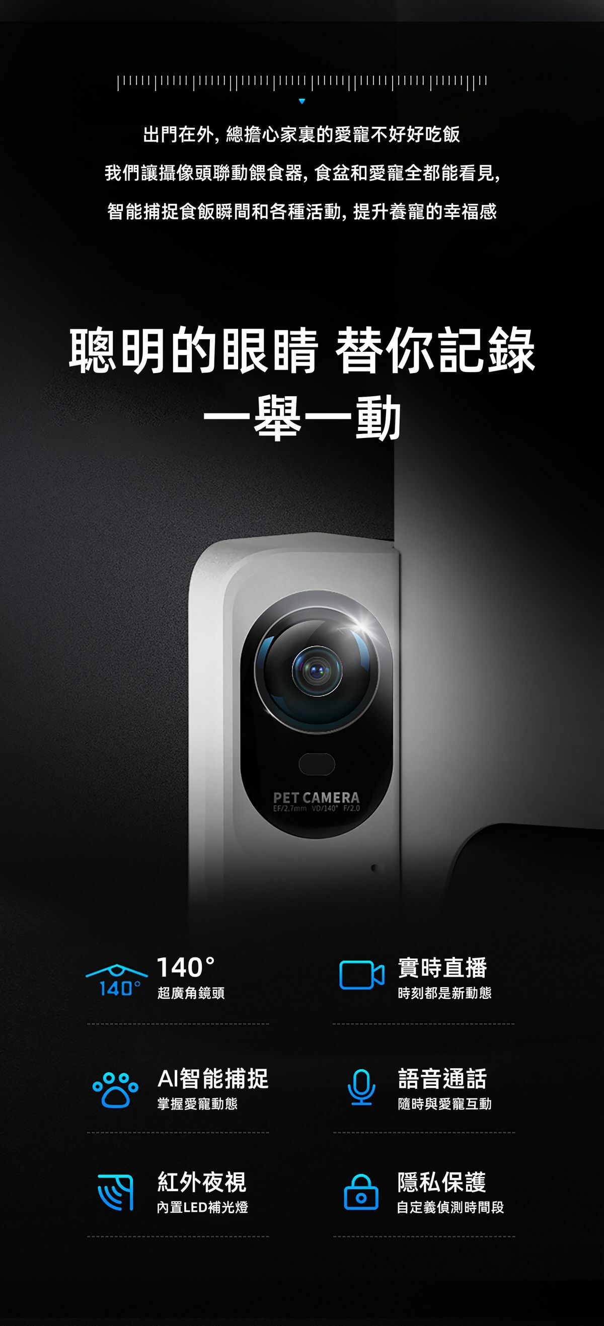 - 140°超廣角夜視鏡頭,食盆與愛寵全都看得見