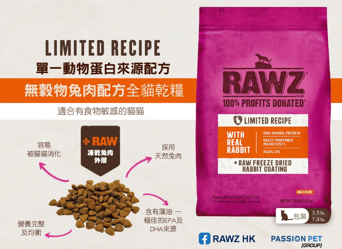 RAWZ 為你的貓咪提供100%營養全面均衡的飲食。RAWZ – 單一蛋白真實兔肉配方 在美國製造,製作過程中只採用最少加工,以真正兔肉製成,並在表面添加了一層生凍乾兔肉塗層,最大程度提高乾糧對貓咪的吸引力。RAWZ 的高蛋白配方減少的碳水化合物含量,同時提供健康優質的食糧、高度易消化的蛋白質和適量的天然脂肪。使用人類等級原料,成分易於消化,沒有動物肉類副產品,不含提煉脂肪,僅採用脫水兔肉作為蛋白質來源,我們致力於為你的貓咪還原最天然健康的飲食模式。配方中保證不添加乳製品、小麥、雞蛋、馬鈴薯、玉米或大豆,這種不含麩質、穀物或穀粒的糧食,能夠最大程度上減少貓咪過敏或者不耐受的可能性。配方中亦含有藻油、牛磺酸以及多種維生素及礦物質,這些添加的成分能發揮多重功效,在皮膚皮毛、心臟健康、免疫系統都對貓咪有極大的益處,我們務求在所有方面都能為貓咪提供均衡而又全面的營養飲食。