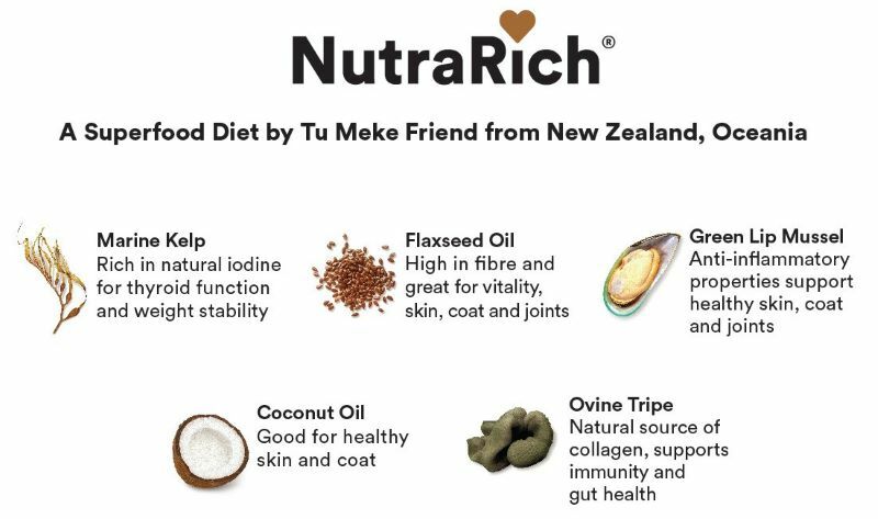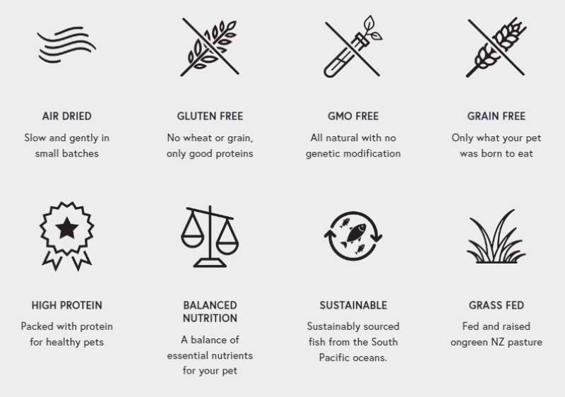 Beef, Beef Liver, Beef Lung, Beef Kidney, Lamb Tripe, Salmon, Mackerel, Flaxseed Oil, Coconut Oil, Green Lipped Mussel, Flaxseed, Carrot, Kumera/Sweet Potato, Dipotassium Phosphate, Kelp, Salt, Calcium Carbonate, Choline Chloride, Taurine, Natural Antioxidant, Iron Organic, Zinc, Vitamin E, Selenium Organic, Copper Organic, Vitamin B1, Vitamin A, Vitamin B3, Vitamin B5, Manganese, Vitamin B2, Vitamin B6, Vitamin D, Biotin, Vitamin B12, Iodine, Folic Acid.
