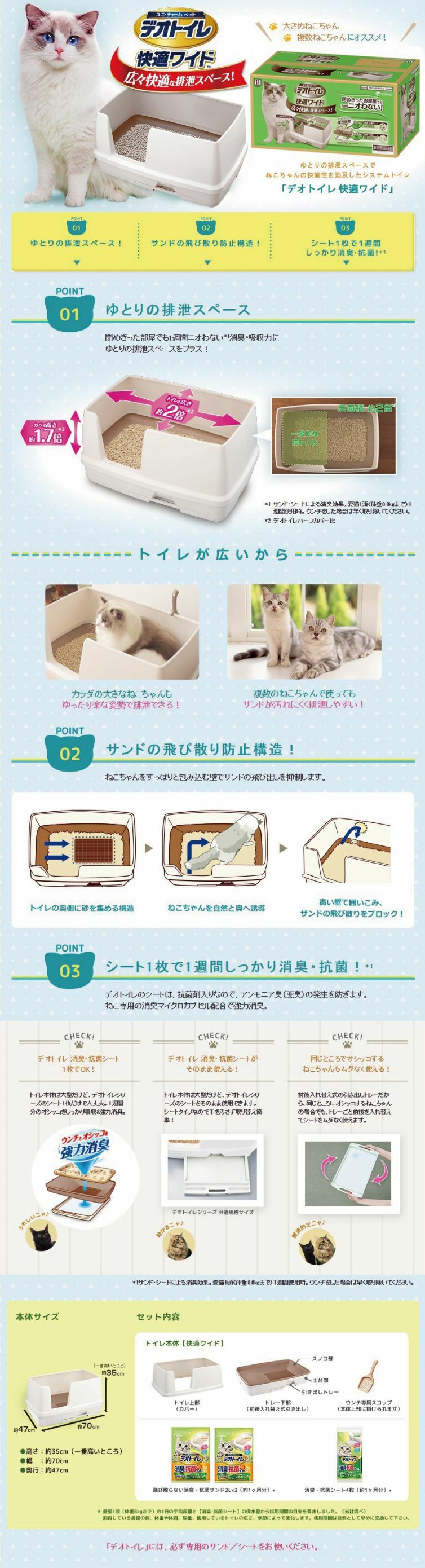 UniCharm的貓砂盤專為減輕你清洗貓砂盤的工作負擔而設,它創先使用由沸石和二氧化矽製成的滲透式貓砂,配合貓砂盤的雙層結構,加長貓砂的使用壽命,同時有效減少貓砂盤臭味。