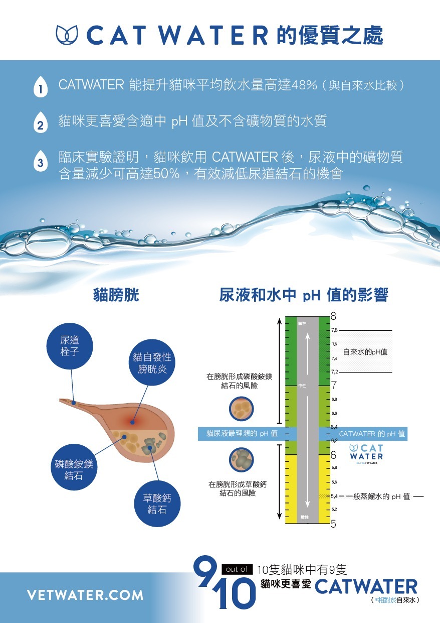 CATWATER 有助於增加貓的飲水量:CATWATER 不含臭氧,不含氯,酸度較低,可鼓勵貓多喝水
