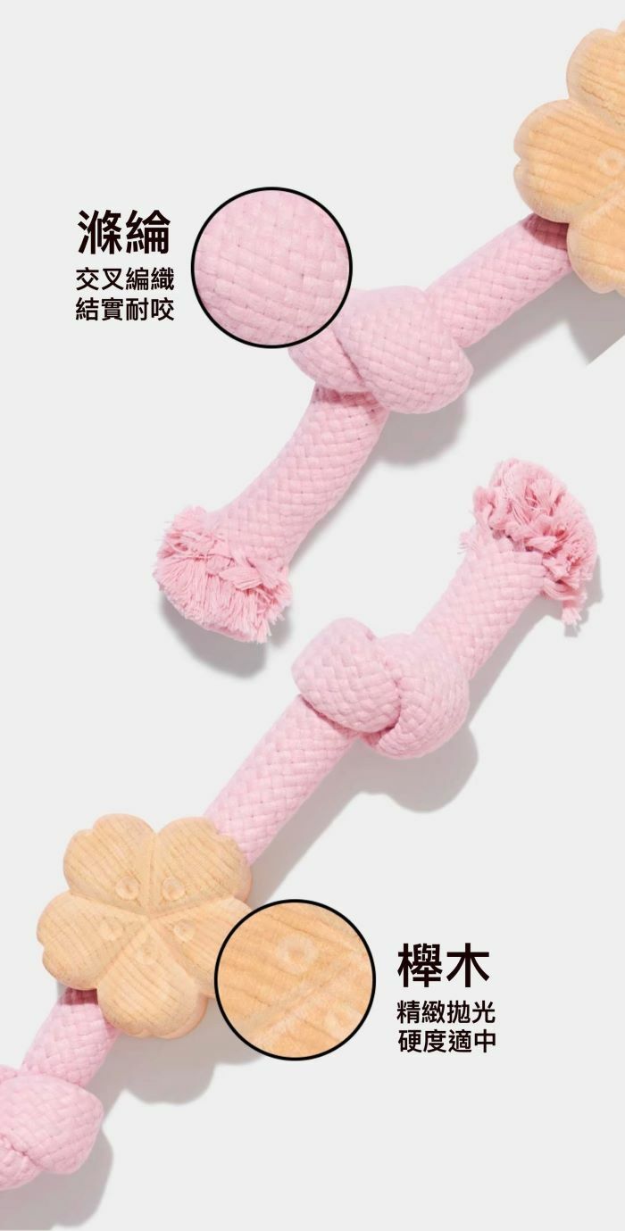 Our rope toy features a beautiful pink cherry blossom-shaped design with a fresh color combination, making it visually appealing. The environmentally friendly, safe, and non-toxic dyeing process ensures the utmost safety for your furry friend, while the beech wood construction adds a touch of natural beauty and durability.