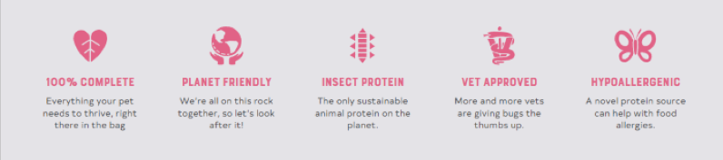 62.5%昆蟲(昆蟲粉40%、新鮮昆蟲19.5%、昆蟲油3%)、燕麥(7%)、馬鈴薯(6.5%)、玉米蛋白、玉米、啤酒酵母、豌豆、礦物質、亞麻籽、番茄粕、蔬菜汁、脫水海藻(0.4%)、菊苣(0.4%)、脫水甜菜根(0.4%)、脫水胡蘿蔔、南瓜、脫水歐芹、脫水羽衣甘藍、軟骨素(290毫克/公斤)、葡萄糖胺(290毫克/公斤)。