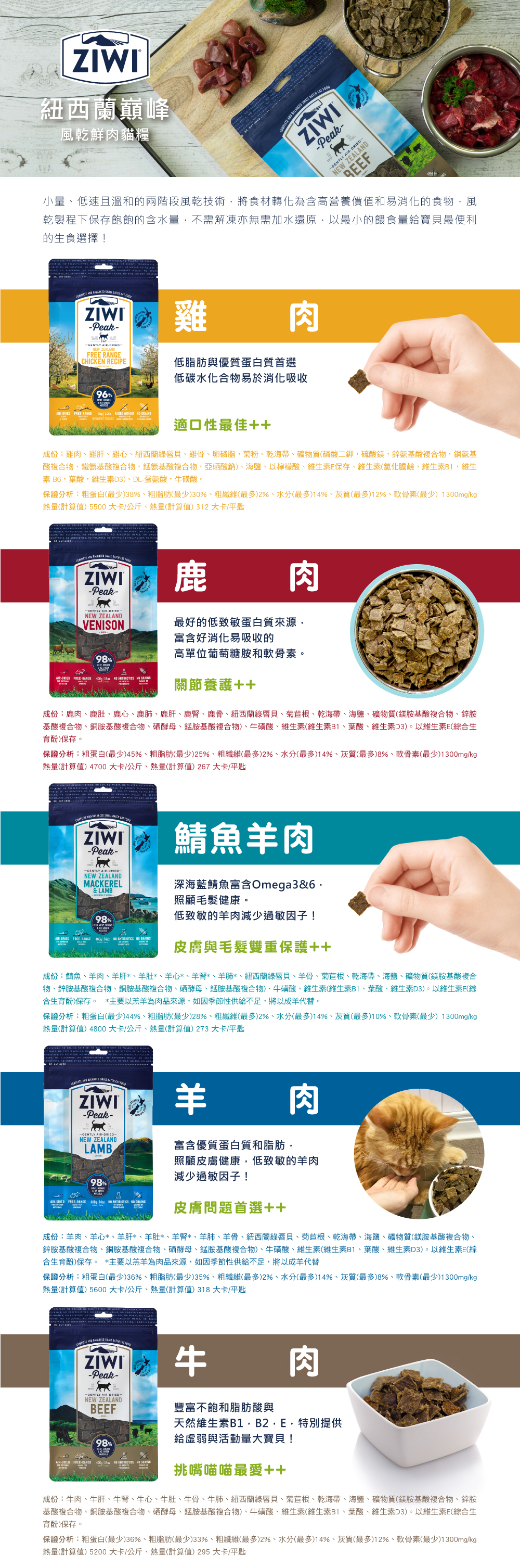 鯖魚,羊肉,羊心,羊草胃,羊肝,羊肺,新西蘭綠唇貽貝,羊腎,羊骨,卵磷脂,菊粉,海帶乾,礦物質,鹽,天然維他命E保存,維他命,DL-蛋氨酸,牛磺酸