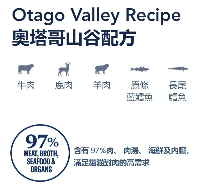 牛肉, 牛肉湯, 鹿肉,原條藍鱈魚, 羊草胃,牛腎,羊肺, 新西蘭綠唇貽貝,羔羊血漿, 鹿草胃, 長尾鱈魚,牛肝, 鹿肺,牛骨,羊肝,羊腎,羊肉, 卵磷脂, 鹿腎,鹿骨, 礦物質(磷酸氫二鉀,硫酸鎂,氨基酸鋅複合物,氨基酸鐵複合物,氨基酸錳複合物,氨基酸銅複合物),DL-蛋氨酸, 維他命( 氯化膽鹼,維他命 E 補充劑, 硝酸硫胺, 菸鹼酸,維他命 B6, 核黃素, 維他命 D3 補充劑, 葉酸) , 乾海帶, 羊骨,牛磺酸