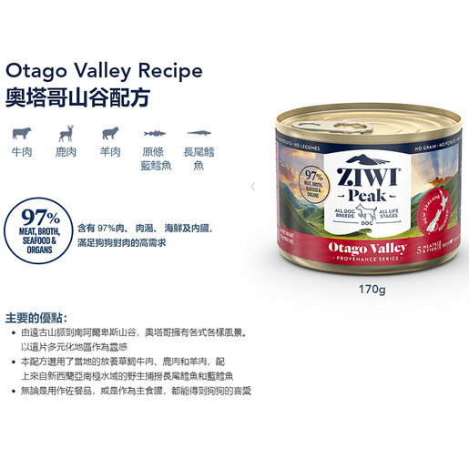 牛肉,牛肉湯,鹿肉,原條藍鱈魚,羊草胃,牛腎,羊肺,新西蘭綠唇貽貝,羊血漿,鹿草胃,長尾鱈魚,卵磷脂,牛肝,鹿肺,牛骨,羊肝,羊腎,羊肉,鹿腎,礦物質(磷酸氫二鉀,硫酸鎂,氨基酸鋅複合物,氨基酸鐵複合物,氨基酸銅複合物,硒酵母氨,基酸錳複合物),鹿骨,乾海帶,羊骨,鹽,維他命(維他命 E 補充劑,硝酸硫胺,維他命 B5 補充劑,維他命 B6,維他命 D3 補充劑,葉酸)